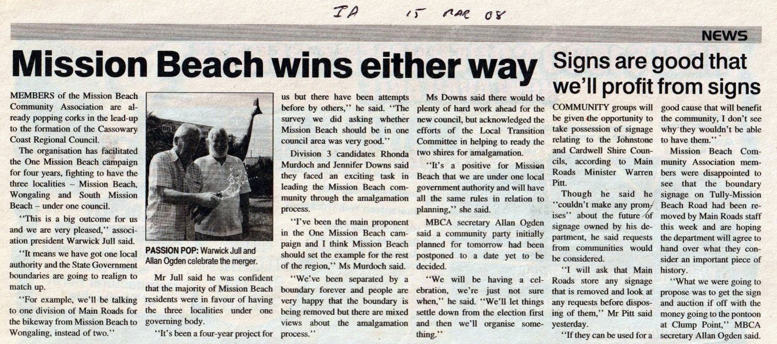 When some residents later called for de-amalgamation, MBCA strongly opposed splitting the council, with then-Mayor Bill Shannon — a former MBCA president — warning of the cost and loss of progress that could follow. MBCA made the case that a united council allowed for better planning, cohesive services, and the realisation of long-term projects, like the Mission Beach Aquatic Centre, which finally opened in 2018 after years of community-driven advocacy.